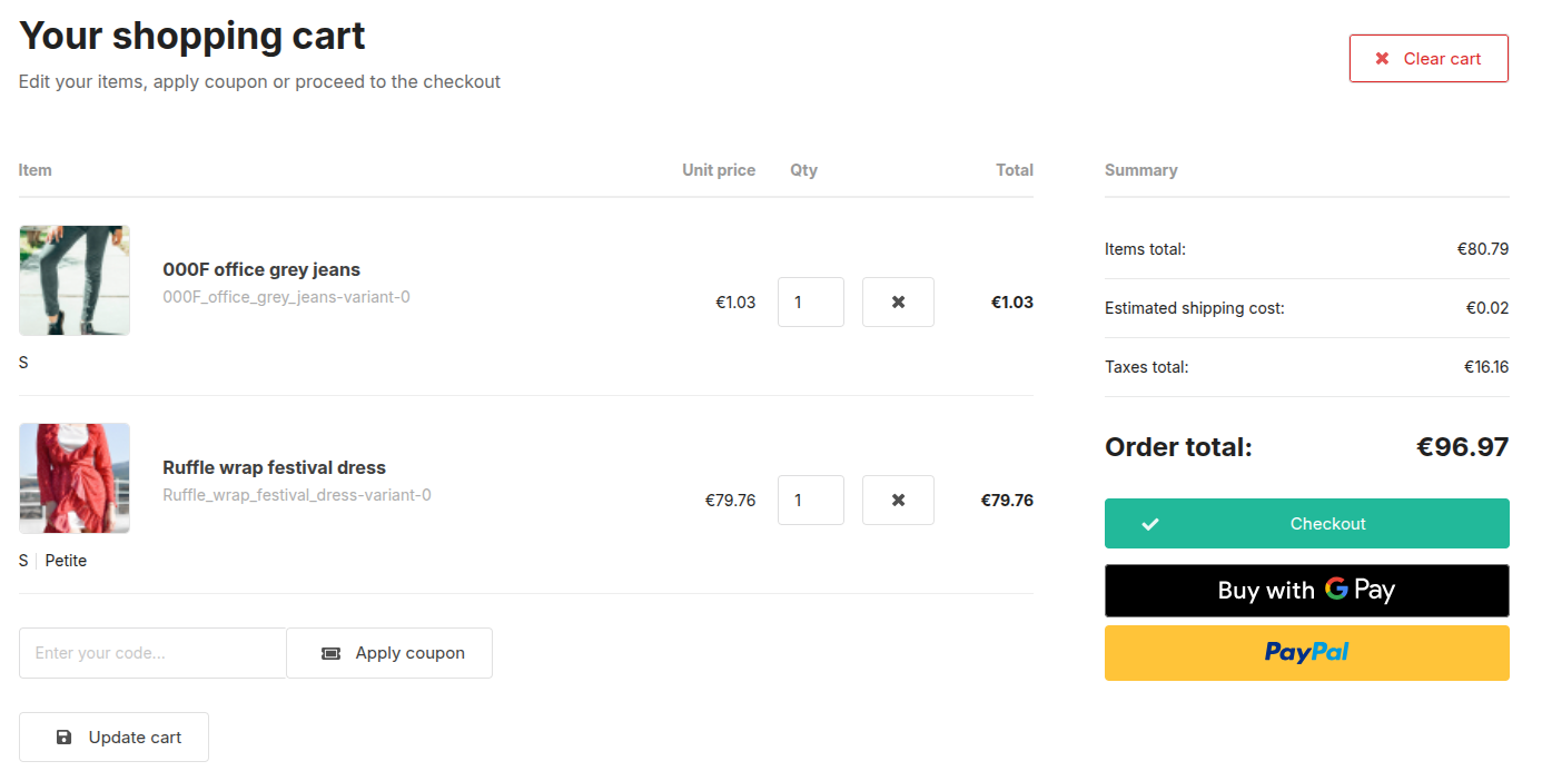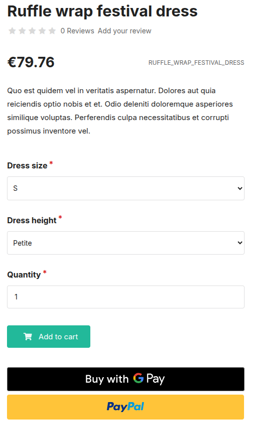 Instead of going through the full Sylius checkout process, customers can select an express payment option (e.g. Apple Pay, Google Pay, PayPal) and confirm their order immediately. The plugin handles the creation of the cart, payment session initialization, and order placement in the background.
