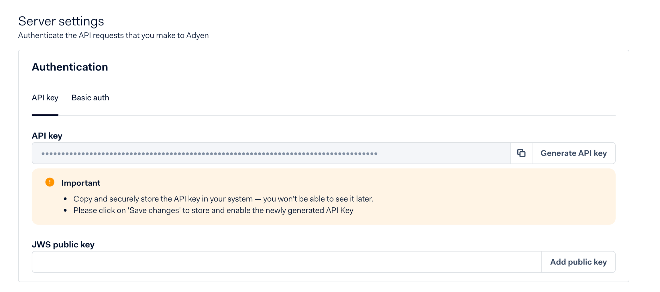 4. In the Server settings section, generate and copy the API key — it will only be shown once.