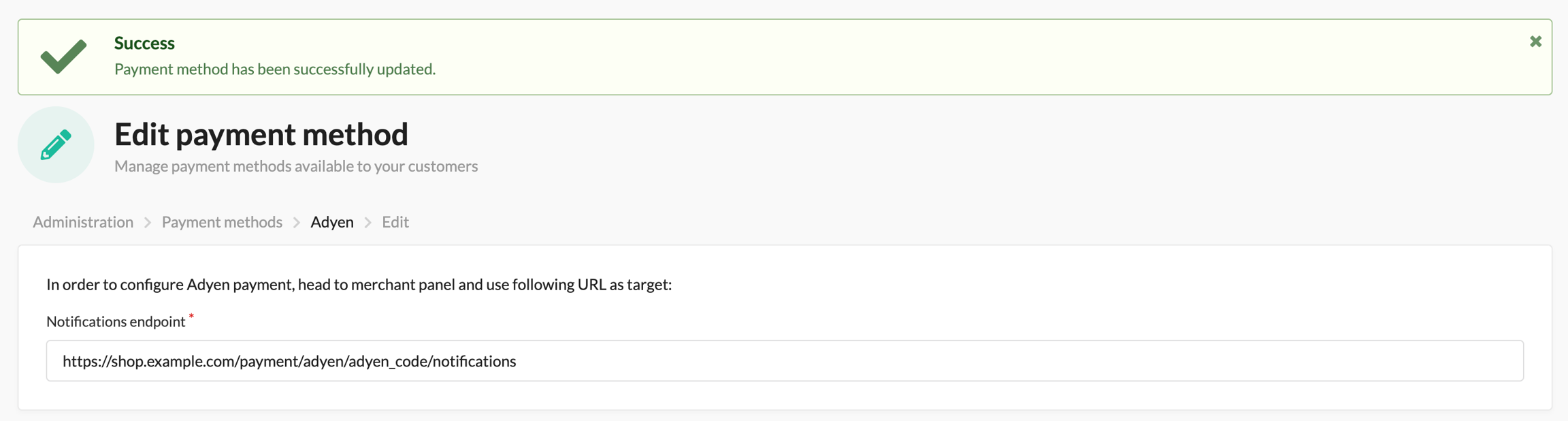 adyen_code).5. In the Server configuration section, set the following Sylius endpoint for handling webhooks: https://shop.example.com/payment/adyen/adyen_code/notifications. Replace adyen_code with the code of your choice.