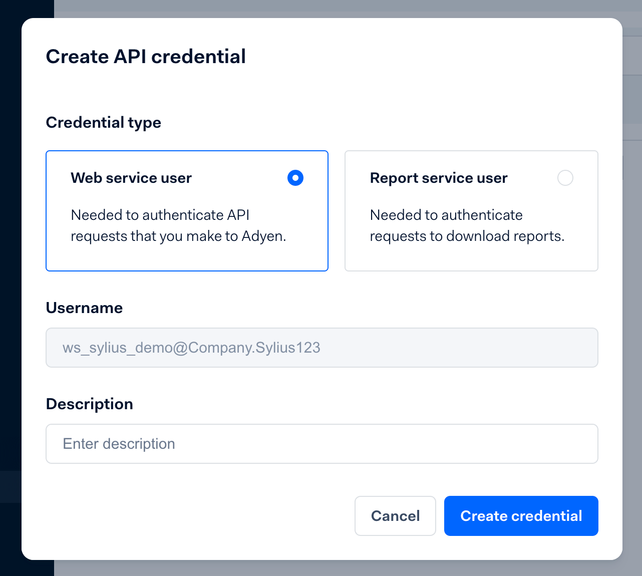 2. Click Create new credential and select Web service user.